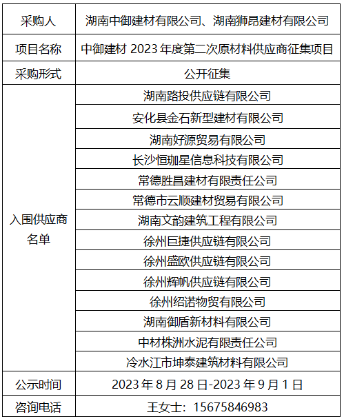 特別說明:請以上入圍供應(yīng)商單位在公示之日起到2023年9月3日17時止至湖南中御建材有限公司進行二次商談,若未在規(guī)定時間內(nèi)進行商談的則視為自動放棄入圍,將取消入圍資格。