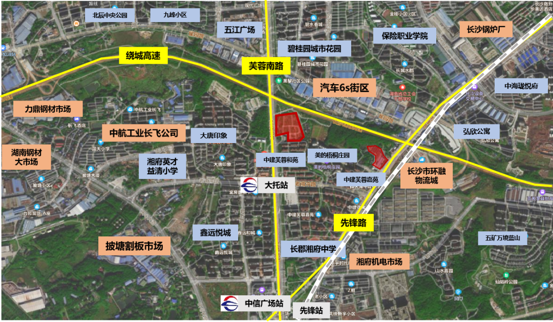 區(qū)位緊鄰長(zhǎng)沙繞城高速,為南部片區(qū)起步區(qū):塊位于天心先鋒街道,屬于南部片區(qū)起步區(qū),為長(zhǎng)株潭融城樞紐單位,具備區(qū)域整體聯(lián)動(dòng)和資源整合的先天優(yōu)勢(shì)。交通便捷,芙蓉路地塊緊鄰地鐵1號(hào)線大托站,先鋒路地塊靠近城鐵先鋒路站:①地鐵站:靠近1號(hào)線大托站和1號(hào)線環(huán)保大道站;②高鐵站:距離長(zhǎng)沙南、湘潭北30分鐘左右車程,距離株洲西站50分鐘左右車程;③城鐵站:先鋒站僅4分鐘即達(dá),附近還有昭山站和九郎山站;④長(zhǎng)途汽車站:距離長(zhǎng)沙汽車南站約12分鐘車程;⑤飛機(jī)場(chǎng):離長(zhǎng)沙黃花機(jī)場(chǎng)約35分鐘車程。處于長(zhǎng)株潭商圈,商業(yè)氛圍濃厚:周邊分布有友阿奧特萊斯、中海寰宇城、五江廣場(chǎng)、汽車6s街區(qū)等綜合商業(yè)體。教育資源豐富:地塊緊靠仰天湖中建小學(xué),周邊配套湘府英才益清小學(xué)、長(zhǎng)沙市長(zhǎng)郡湘府中學(xué)、保險(xiǎn)職業(yè)學(xué)院等學(xué)校,教育資源豐富。